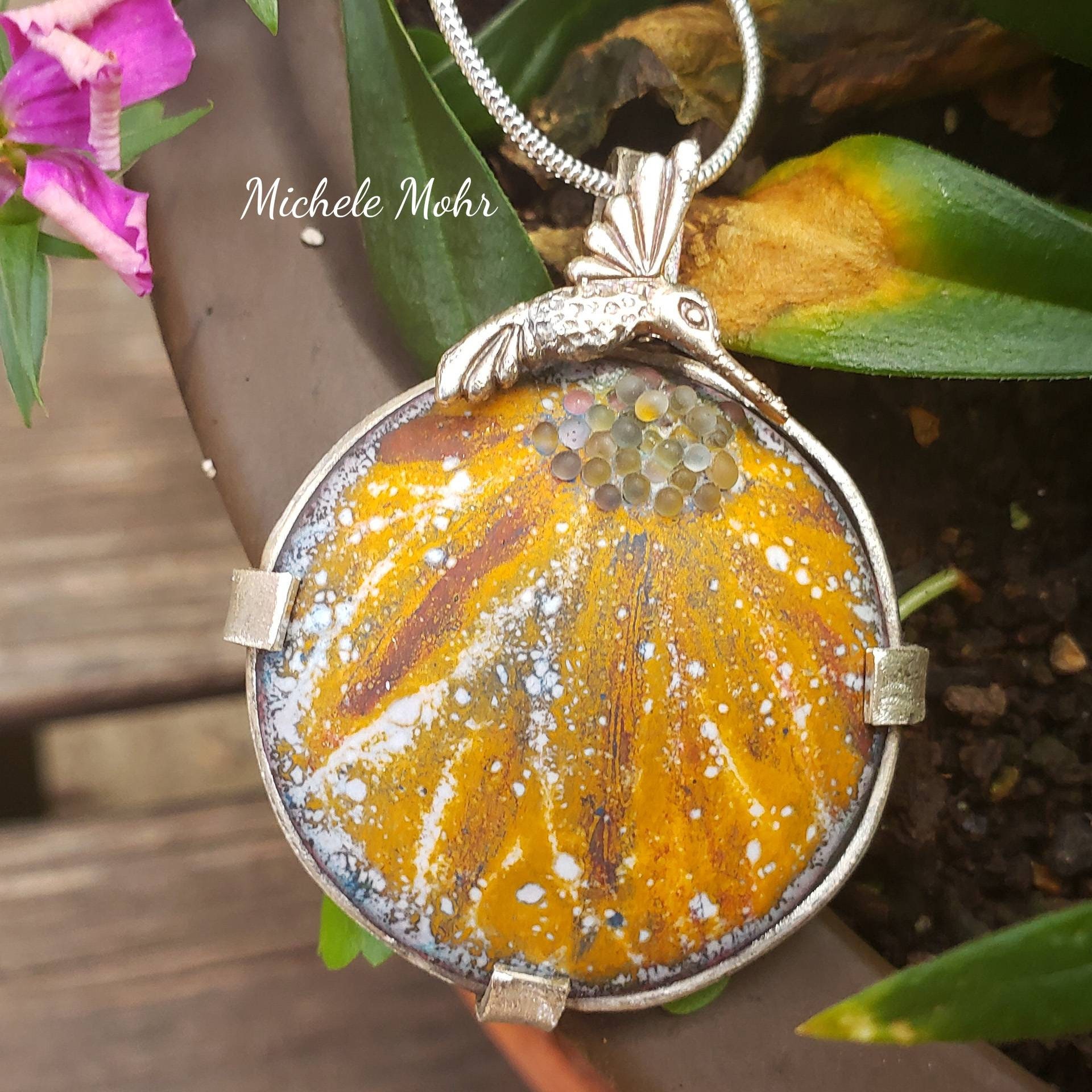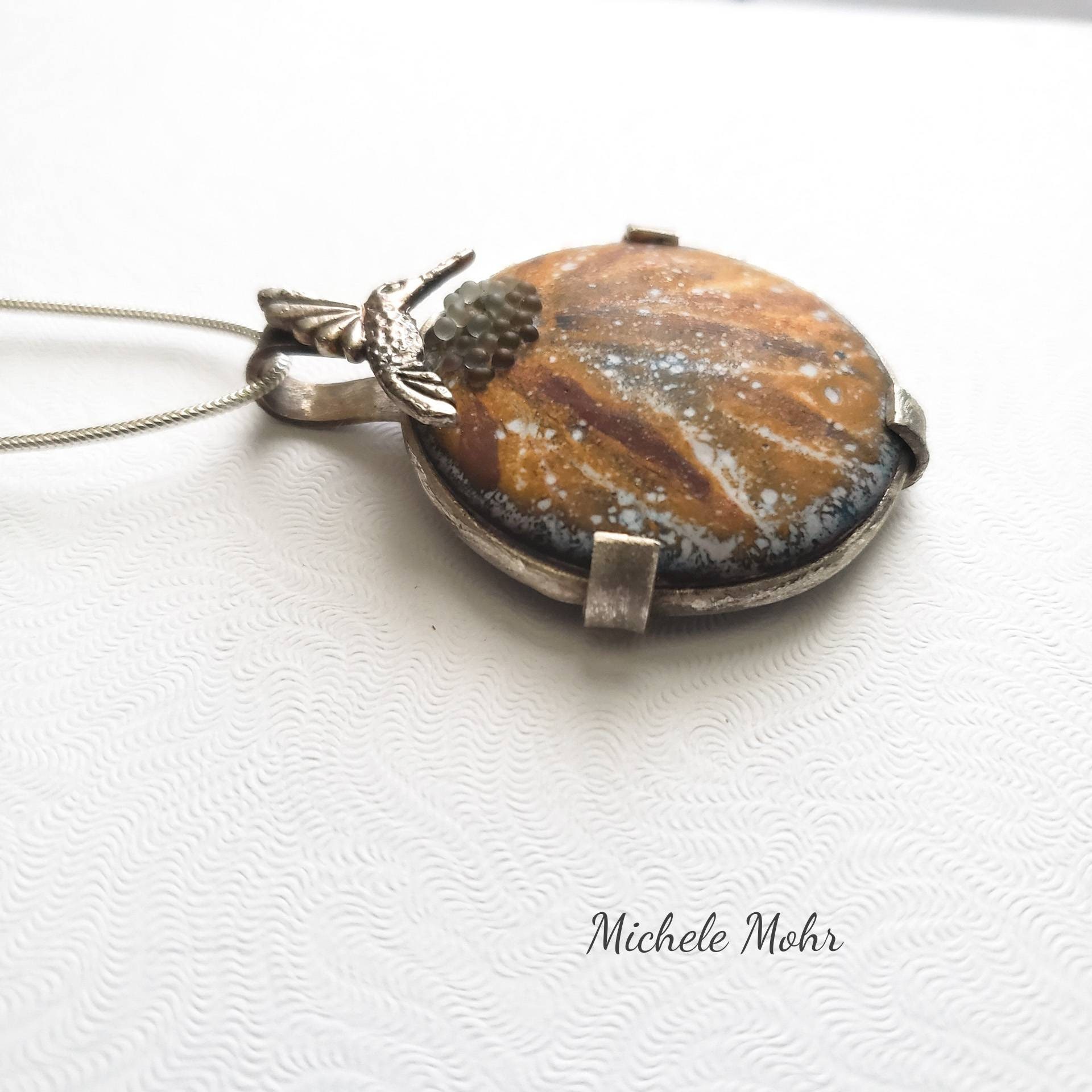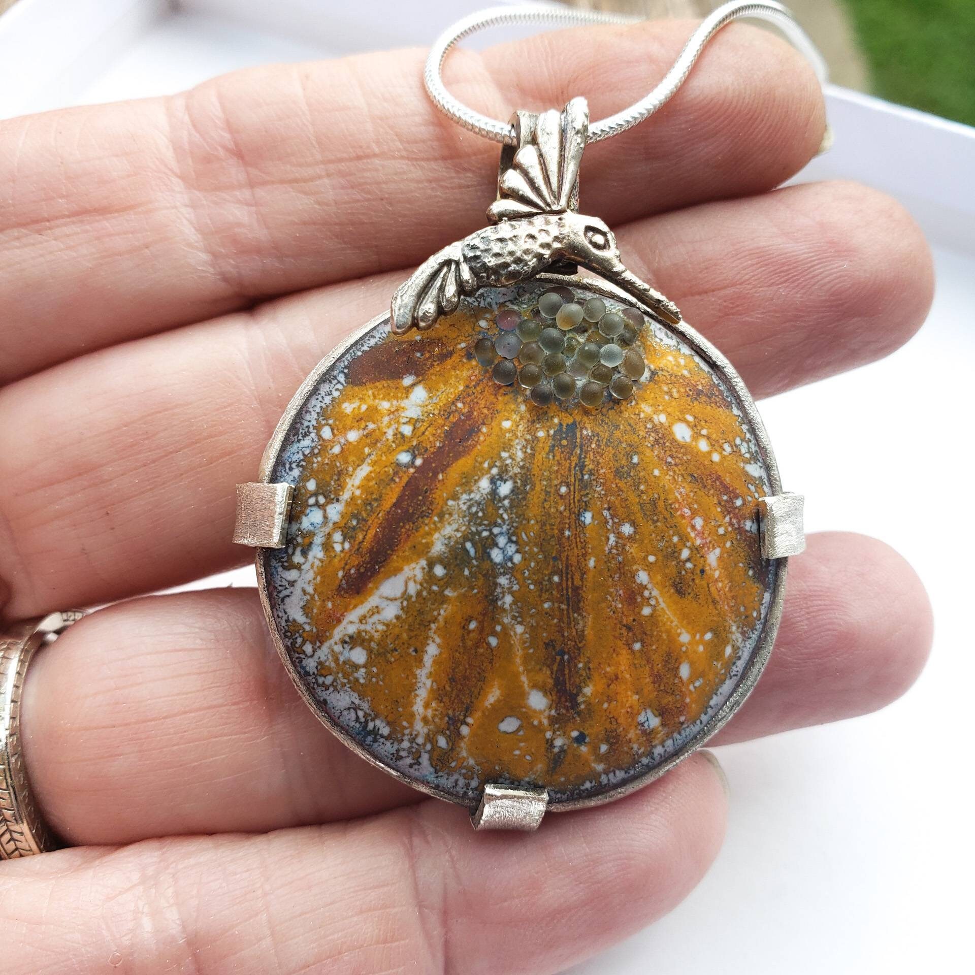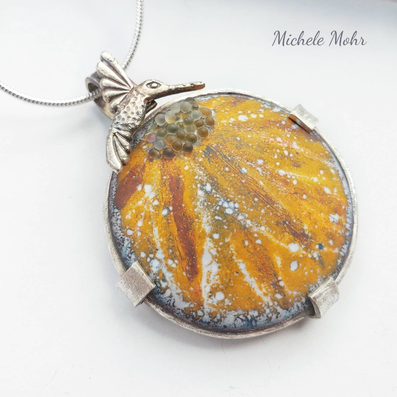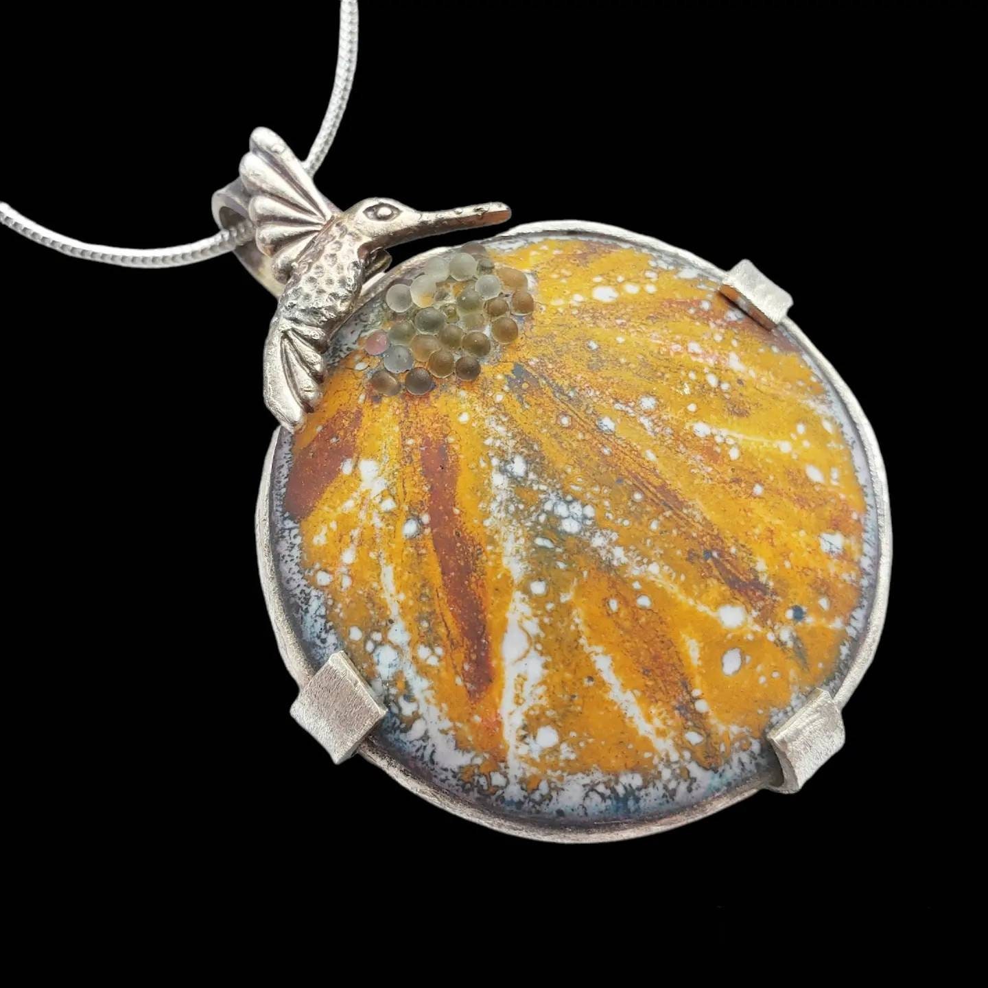 The sterling silver prong setting is hand formed, hammered, soldered and polished, and the enameled piece is hand set into the setting. A cast sterling silver hummingbird soldered to the sterling silver bail. The hummingbird is oxidized and buffed to highlight details.