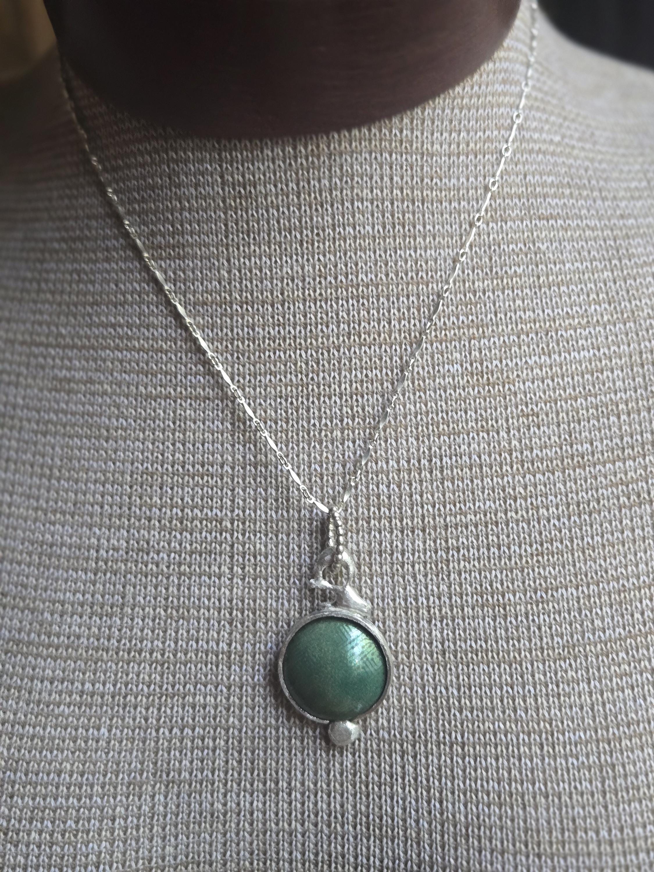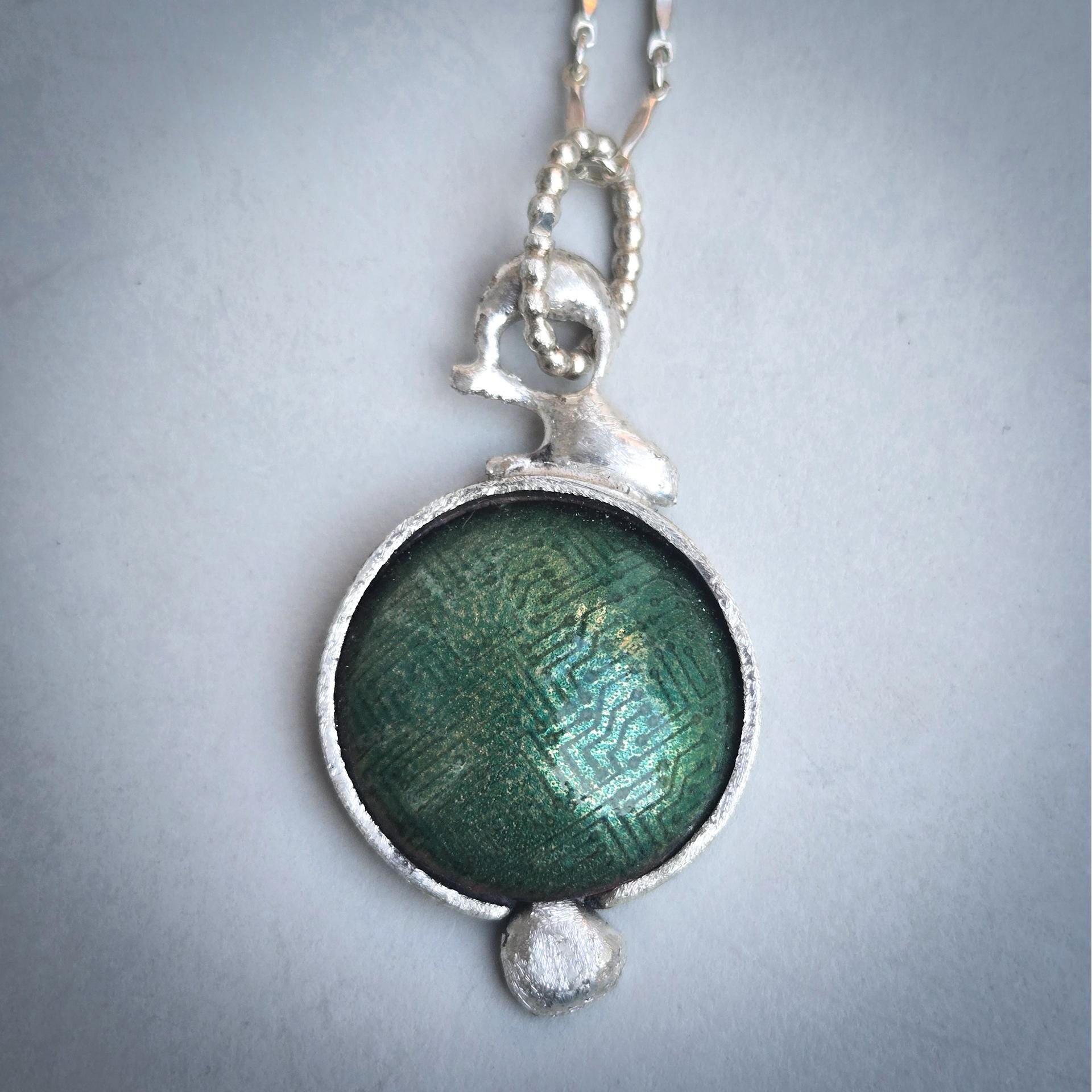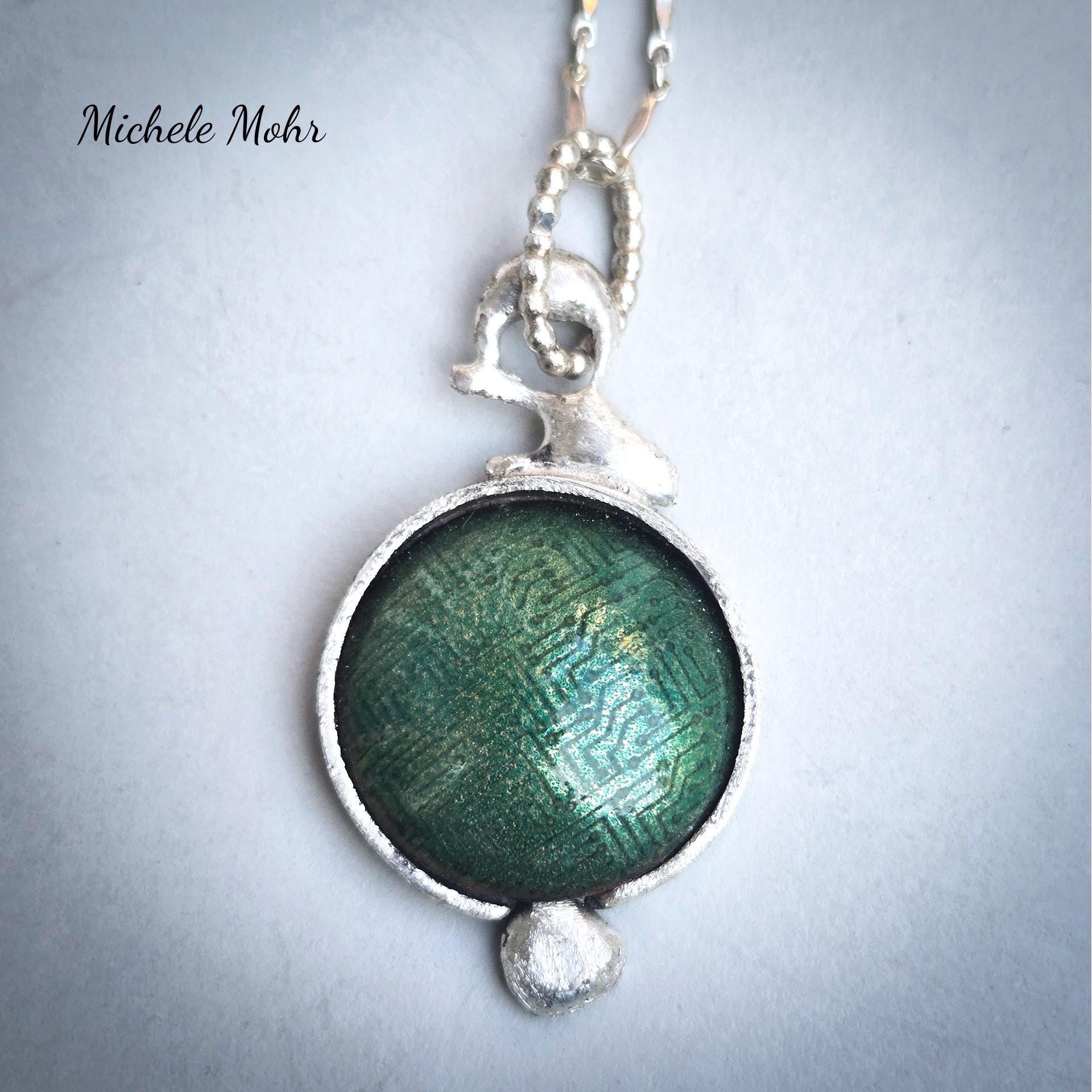 The sterling silver setting is hand forged, textured, soldered and polished, and the enameled piece is hand set into the setting.