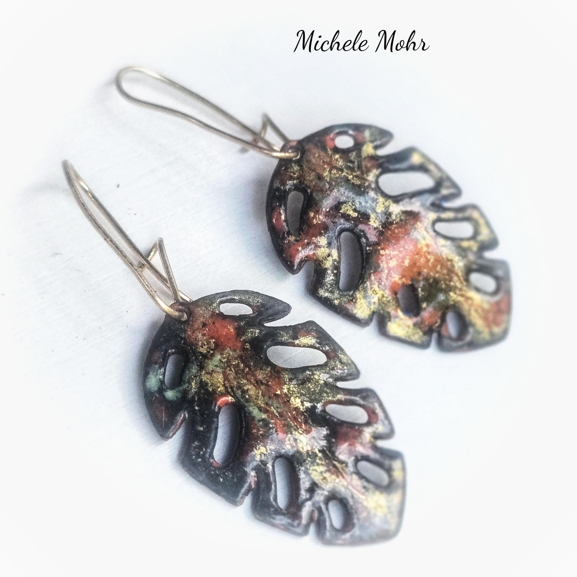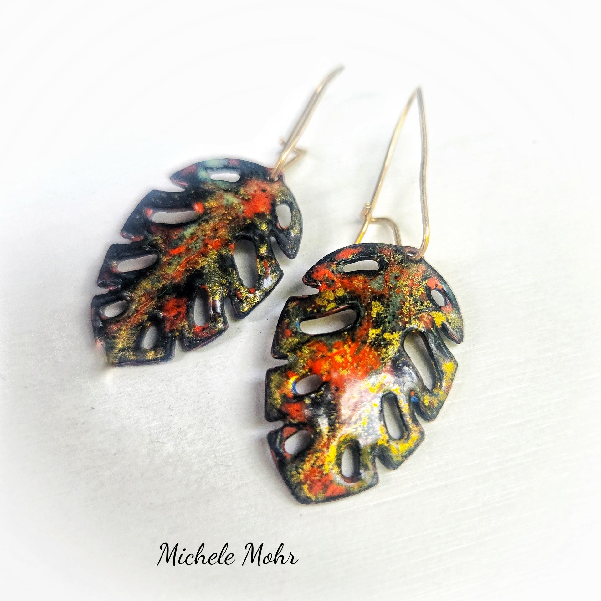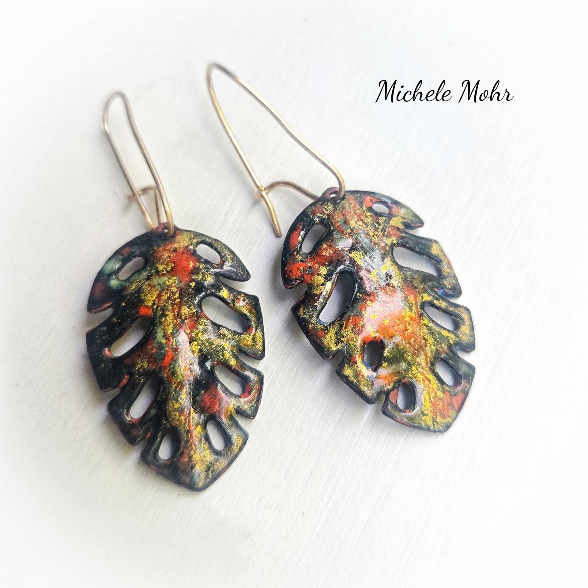 These are one of a kind earrings. They are made with hand forged copper, vitreous enamel (pigmented powdered glass), gold luster, and goldfilledwire. .