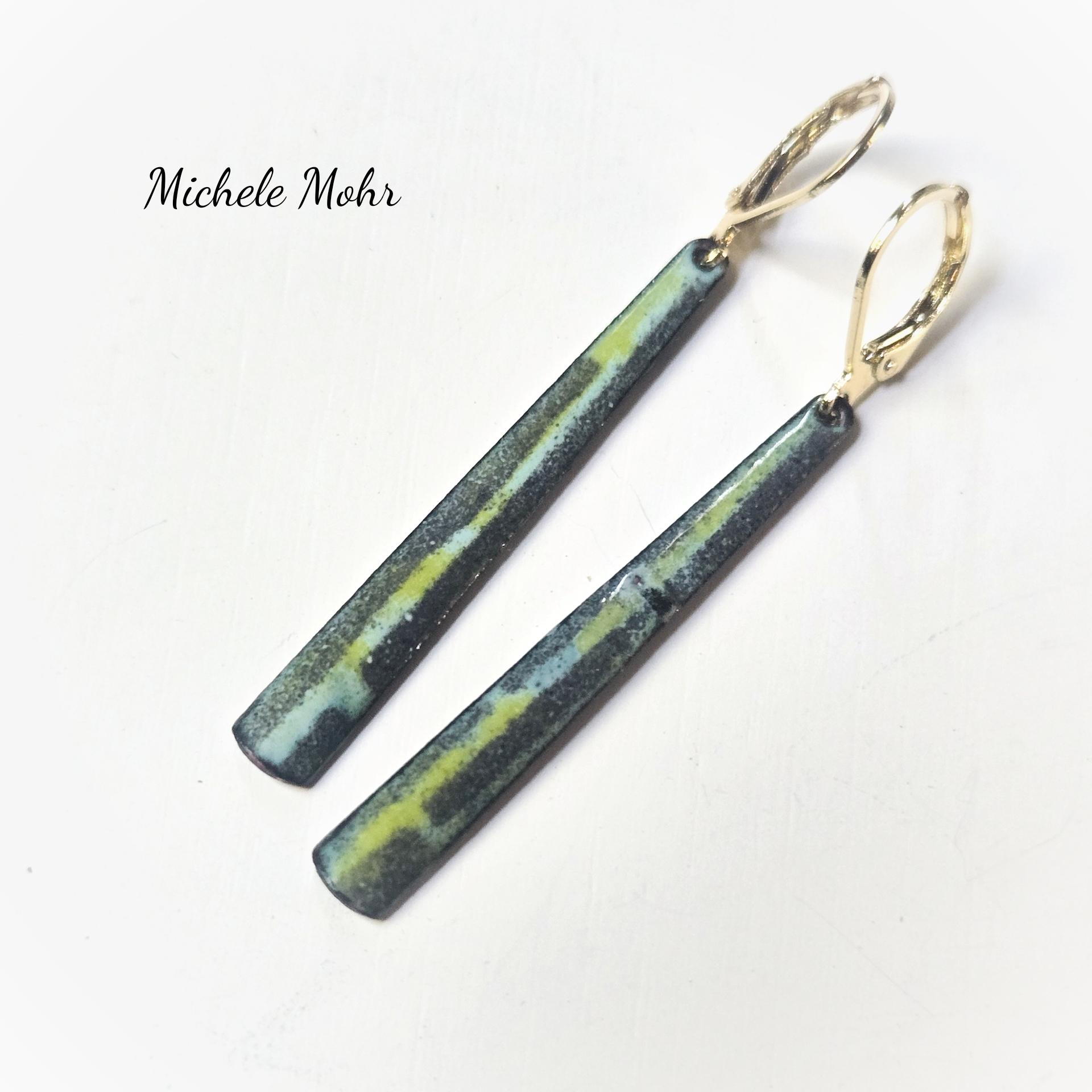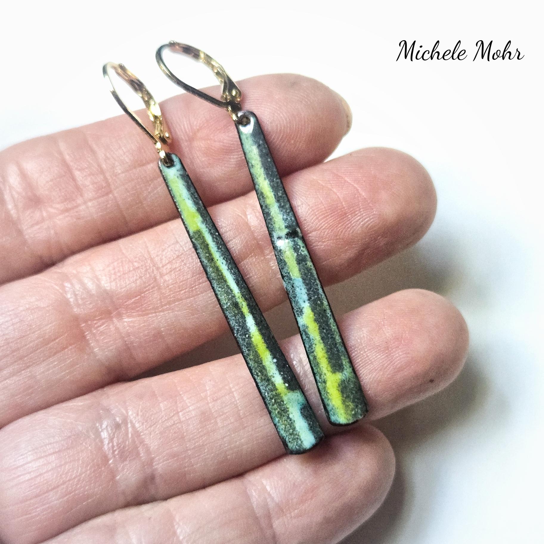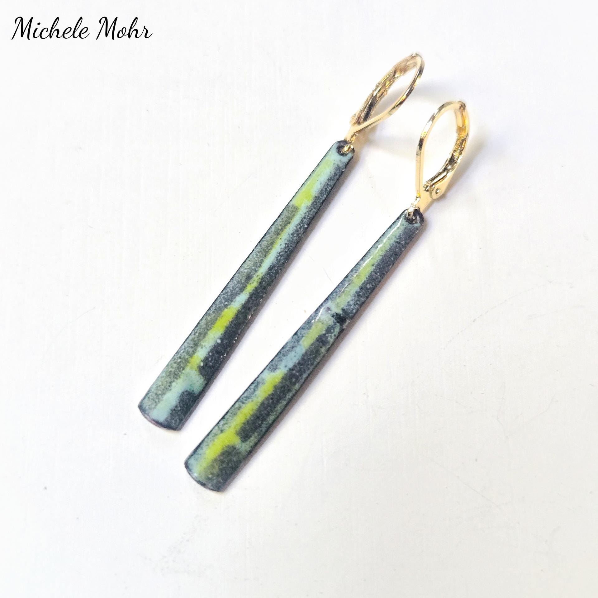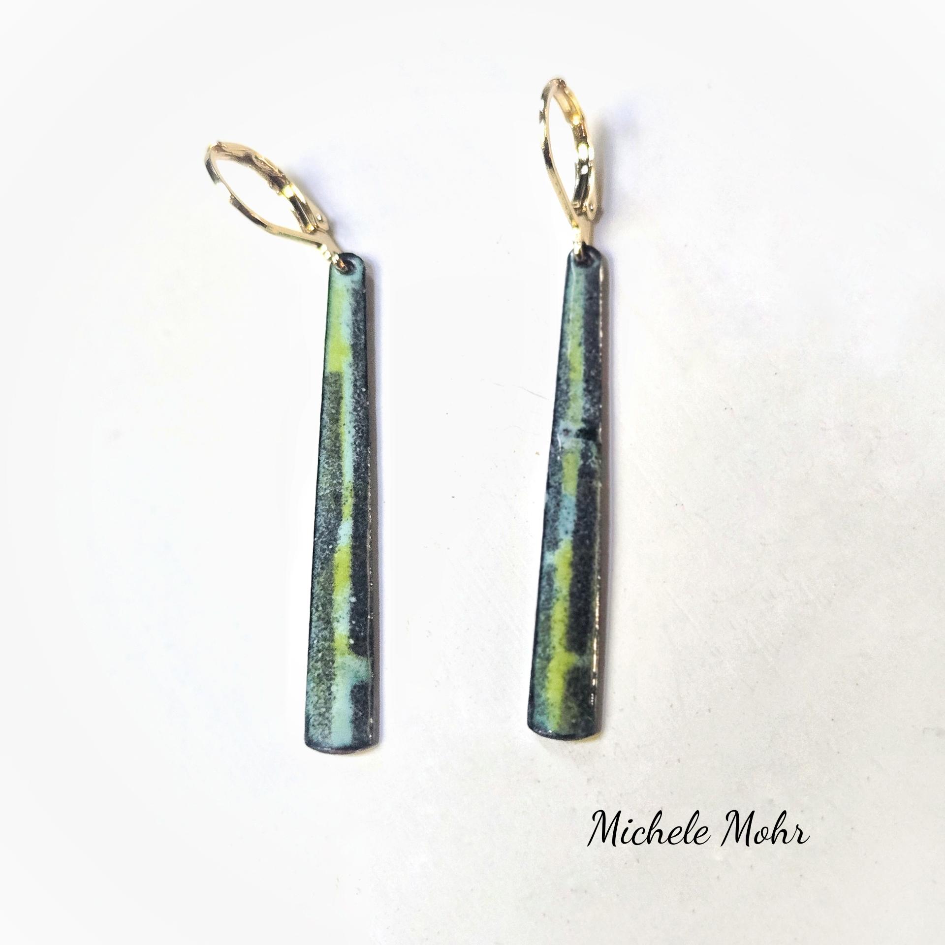 These are one of a kind long stick earrings. They are made with hand forged copper, vitreous enamel (pigmented powdered glass) and 18K Gold Plated surgical steel lever back earwires.