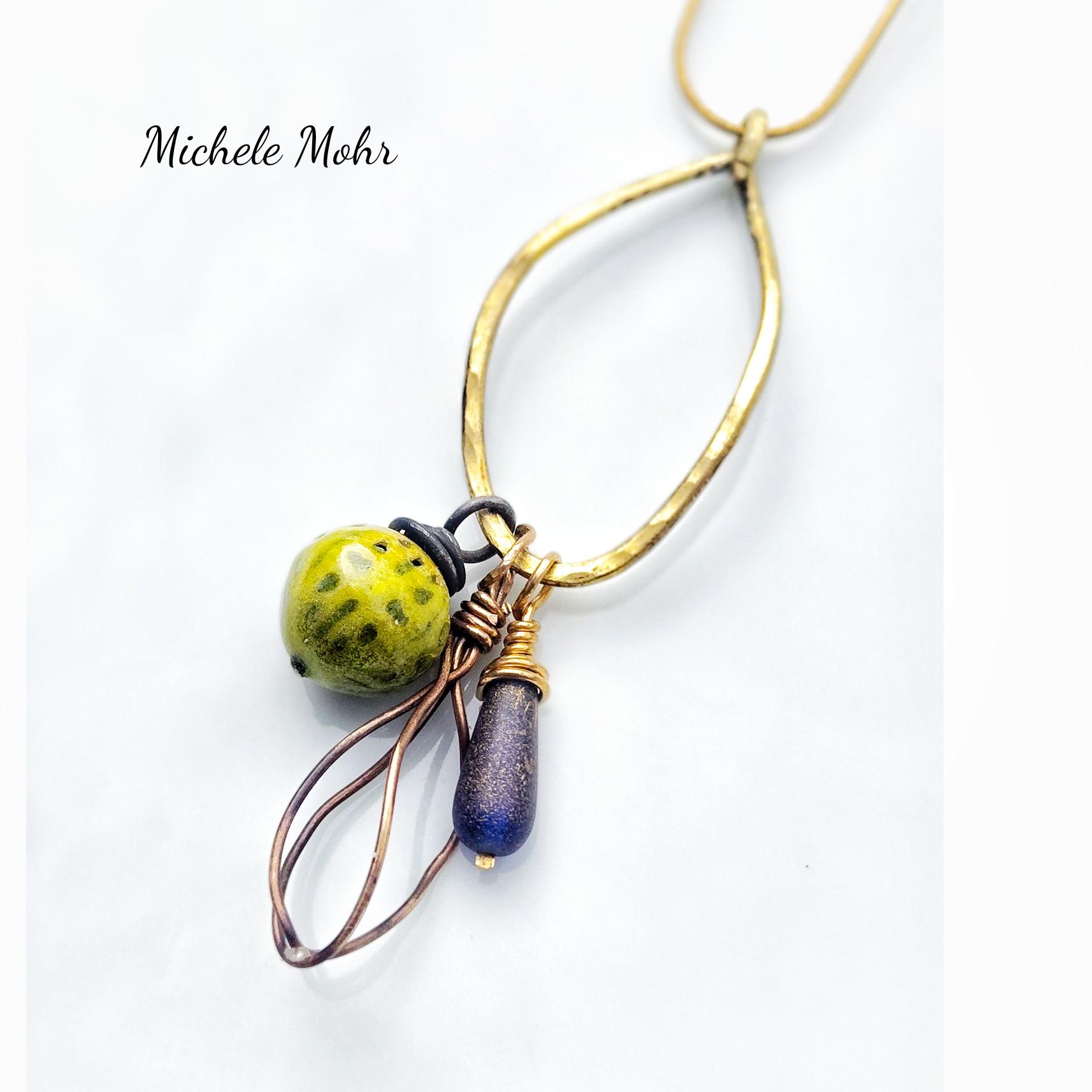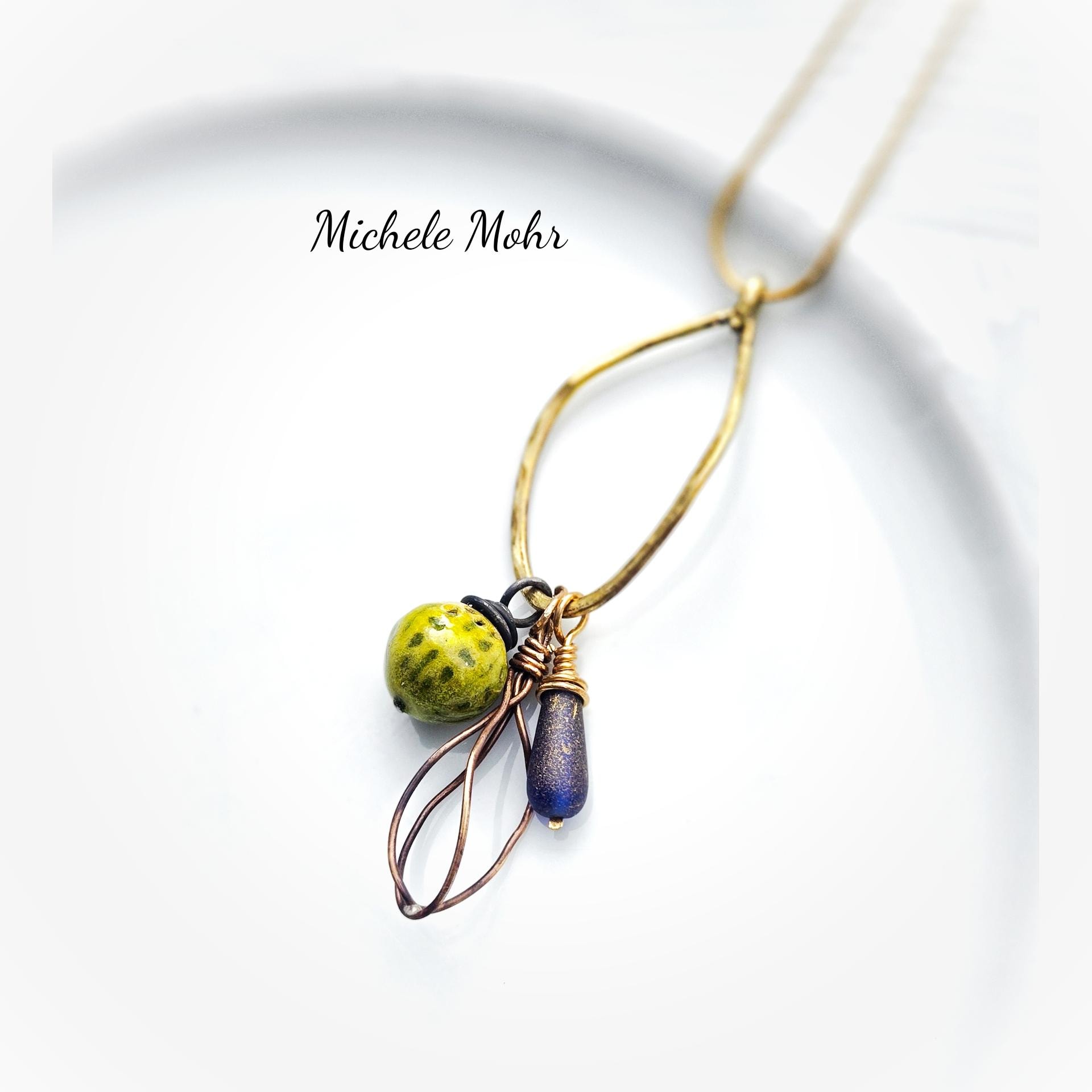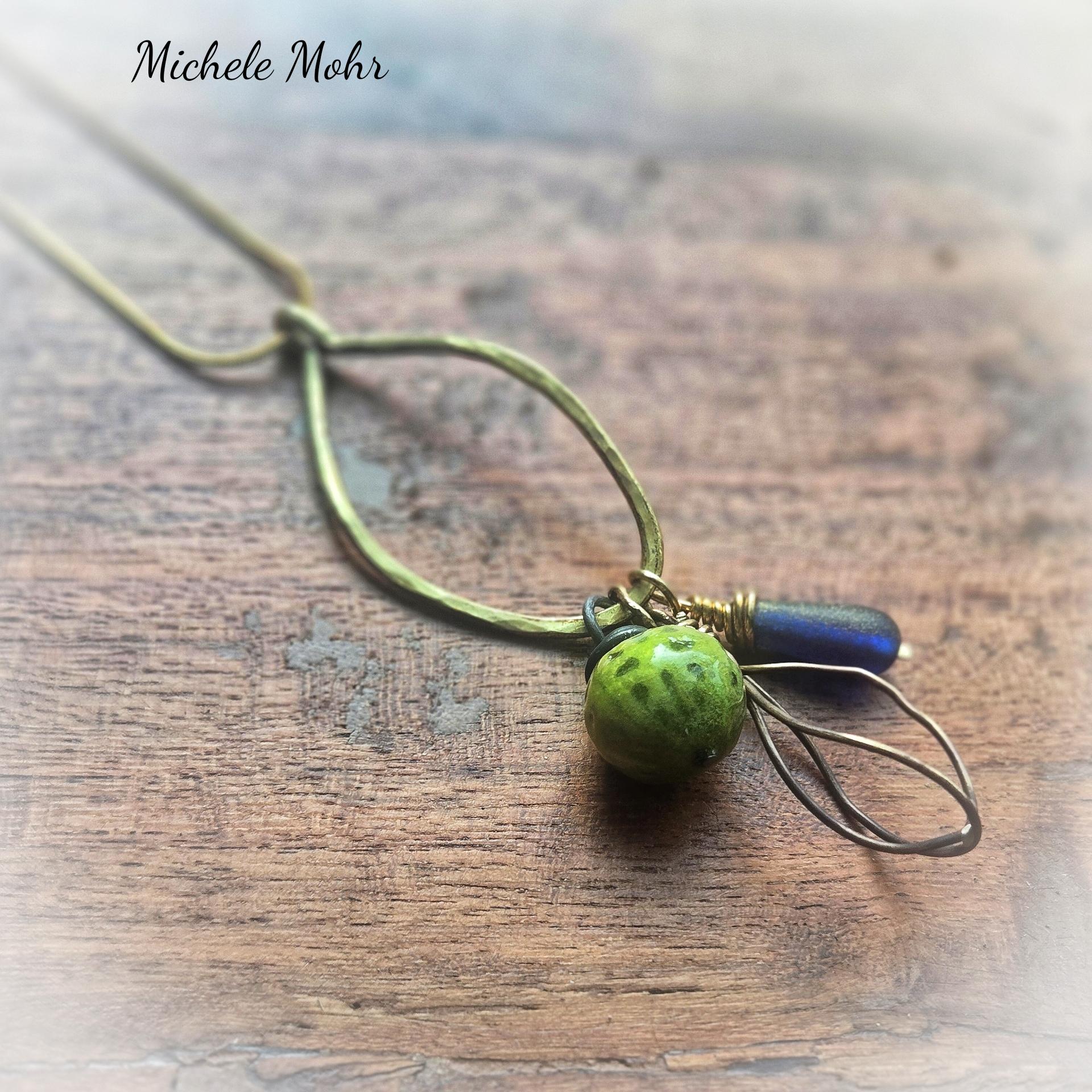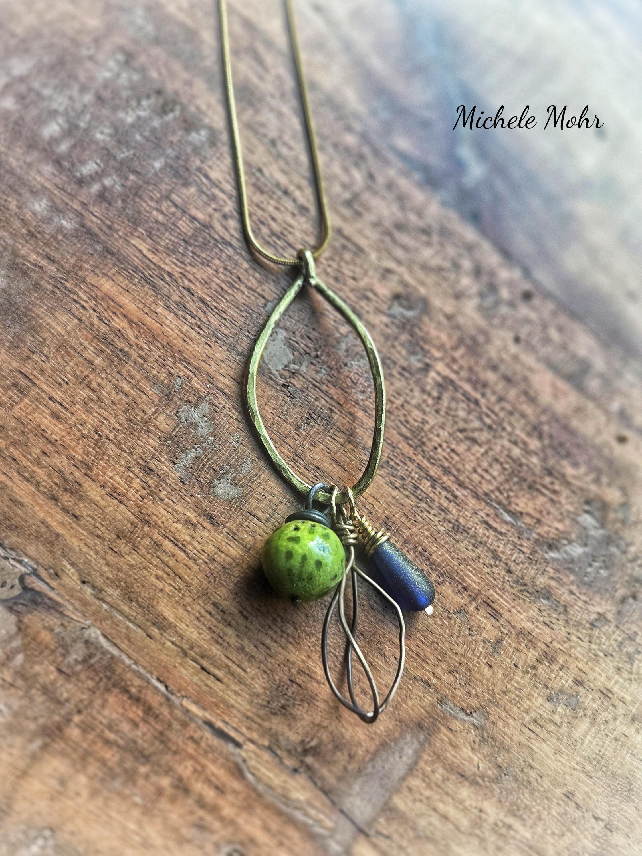 The pendant is hand forged and soldered. The enameled bead is torch fired with beautiful bitter green enamel.. The Czech glass bead is dark blue with gold flecks.