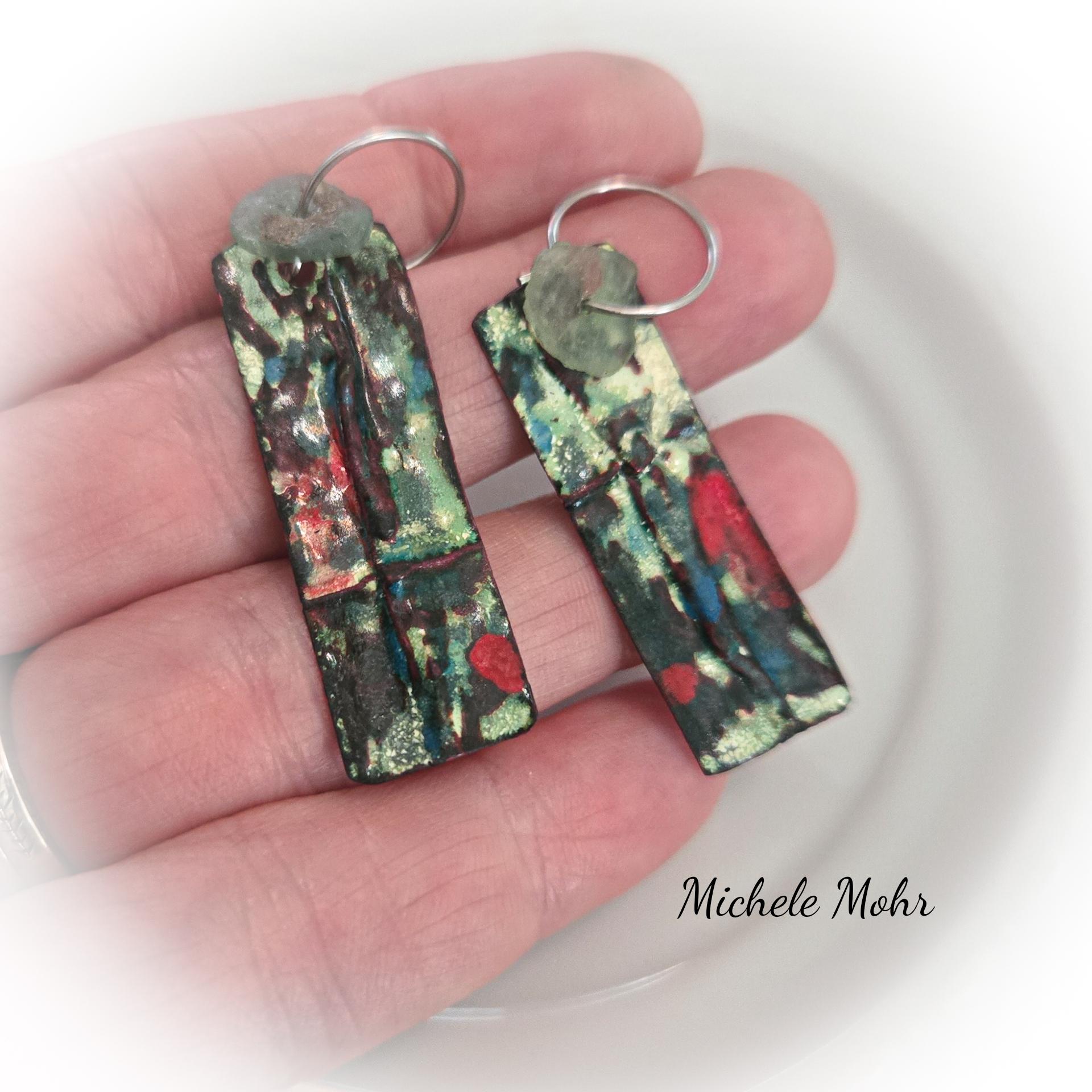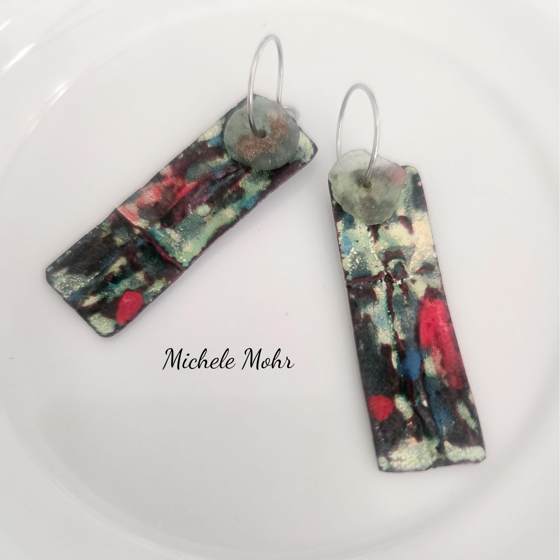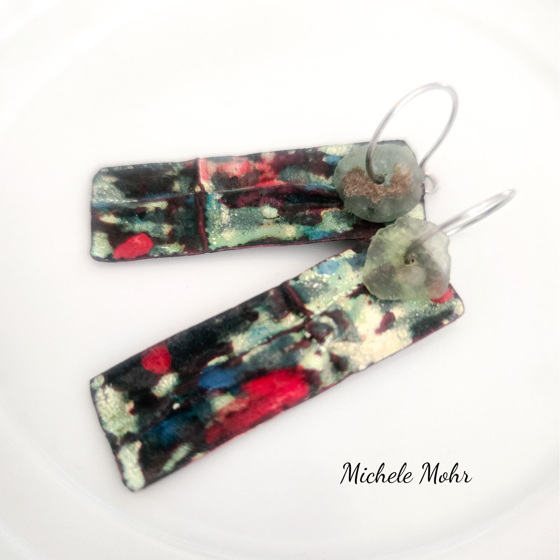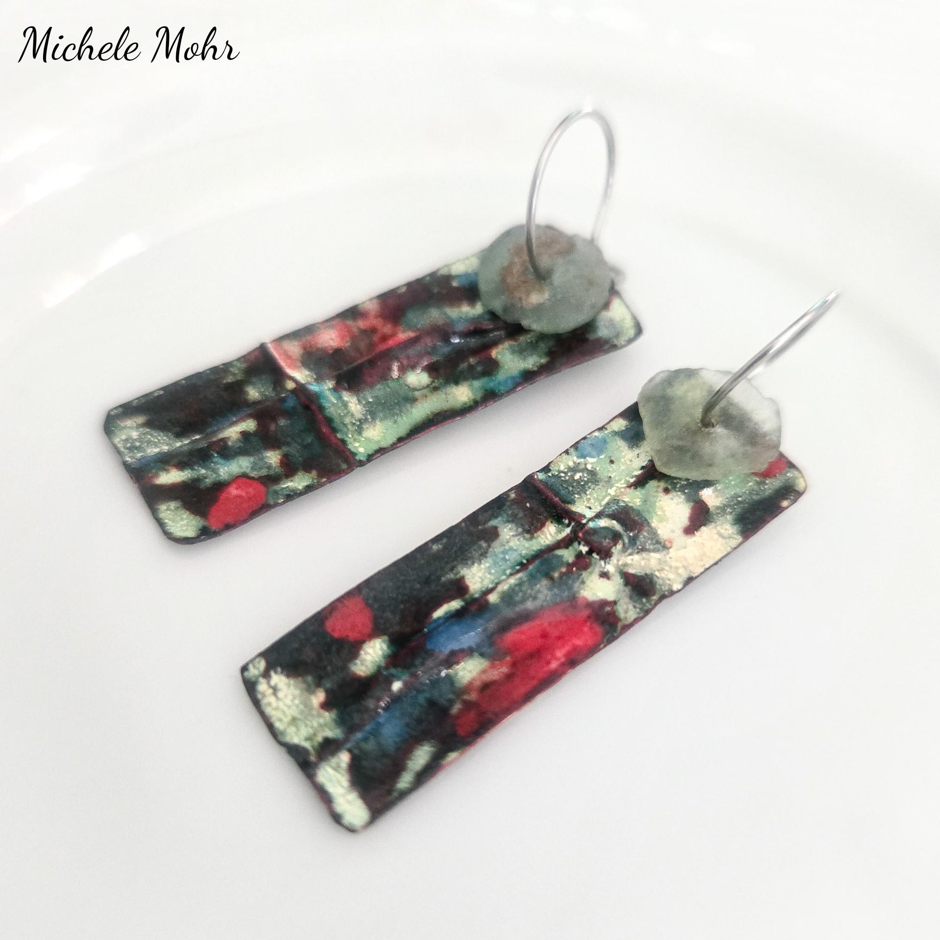 Foldformed Vitreous Enameled Copper and Roman Glass Earrings with Stainless Steel Hoop EarWires: Gazing Out the Window