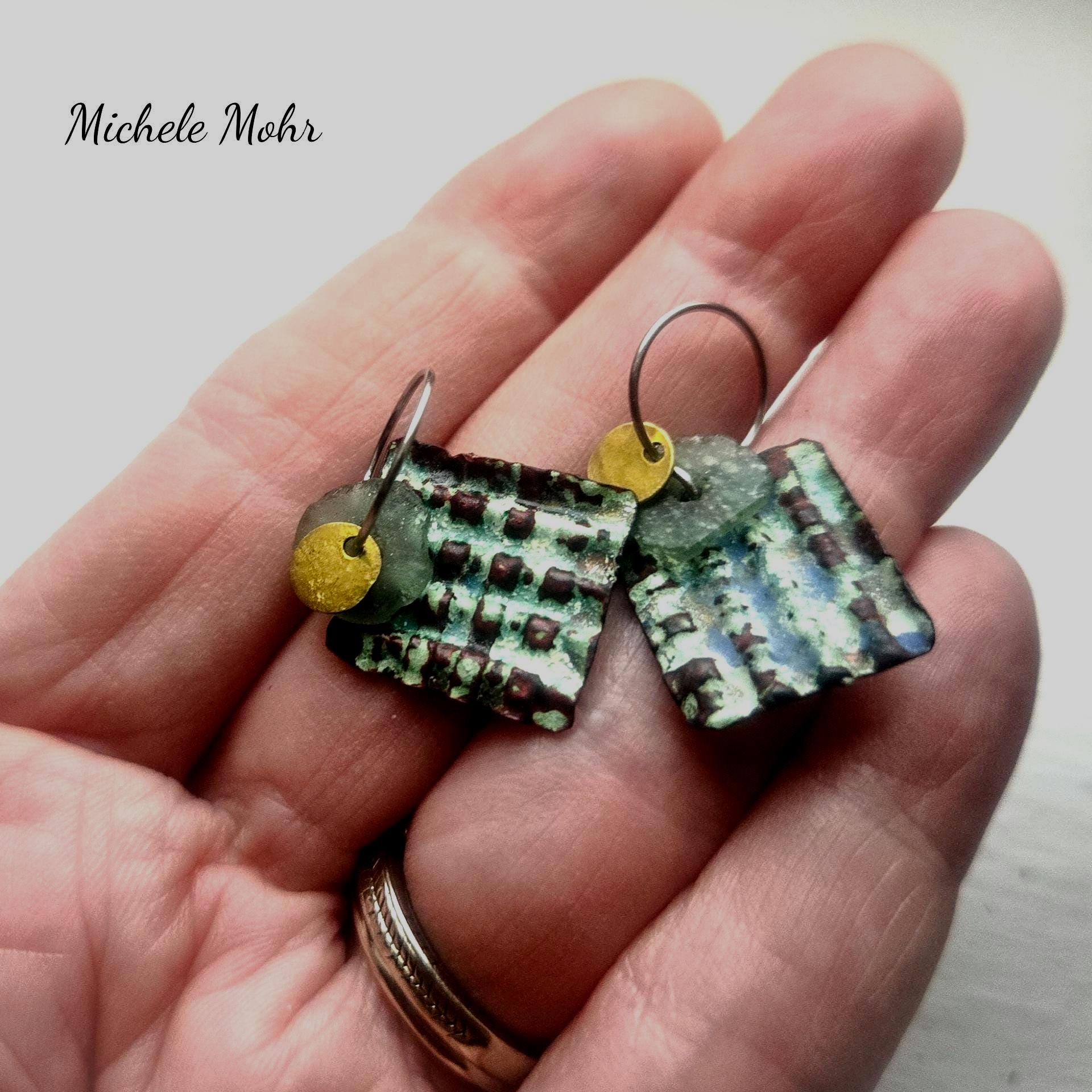 Small Rectangular Corrugated Vitreous Enamel and Earrings with Green Roman Glass and Brass Accents and Stainless Steel Hoop Ear Wires: It Fits