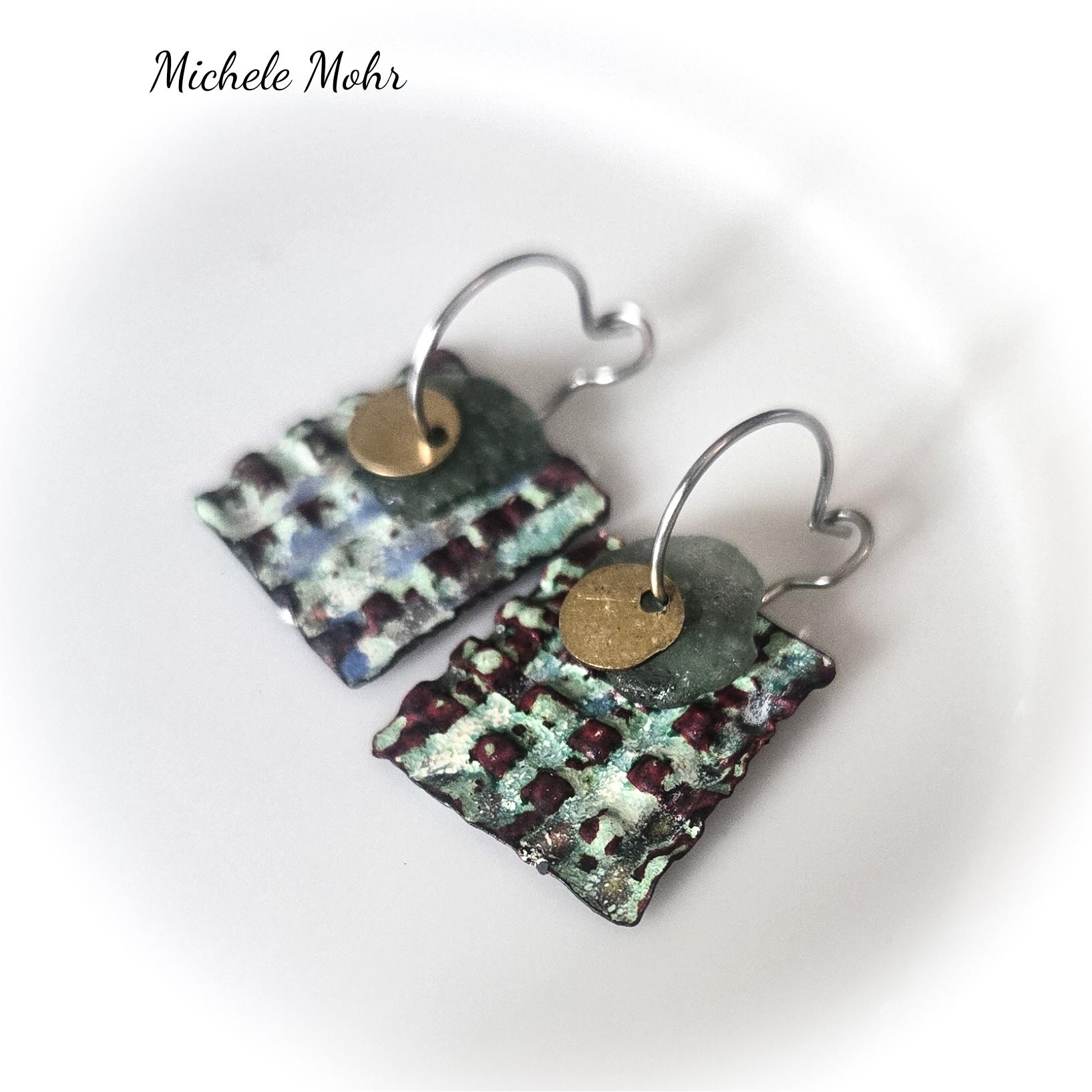 These unique one of a kind earrings have a whimsical vibe. They are created from , vitreous enamel (pigmented powdered glass), copper, and sterling silver.