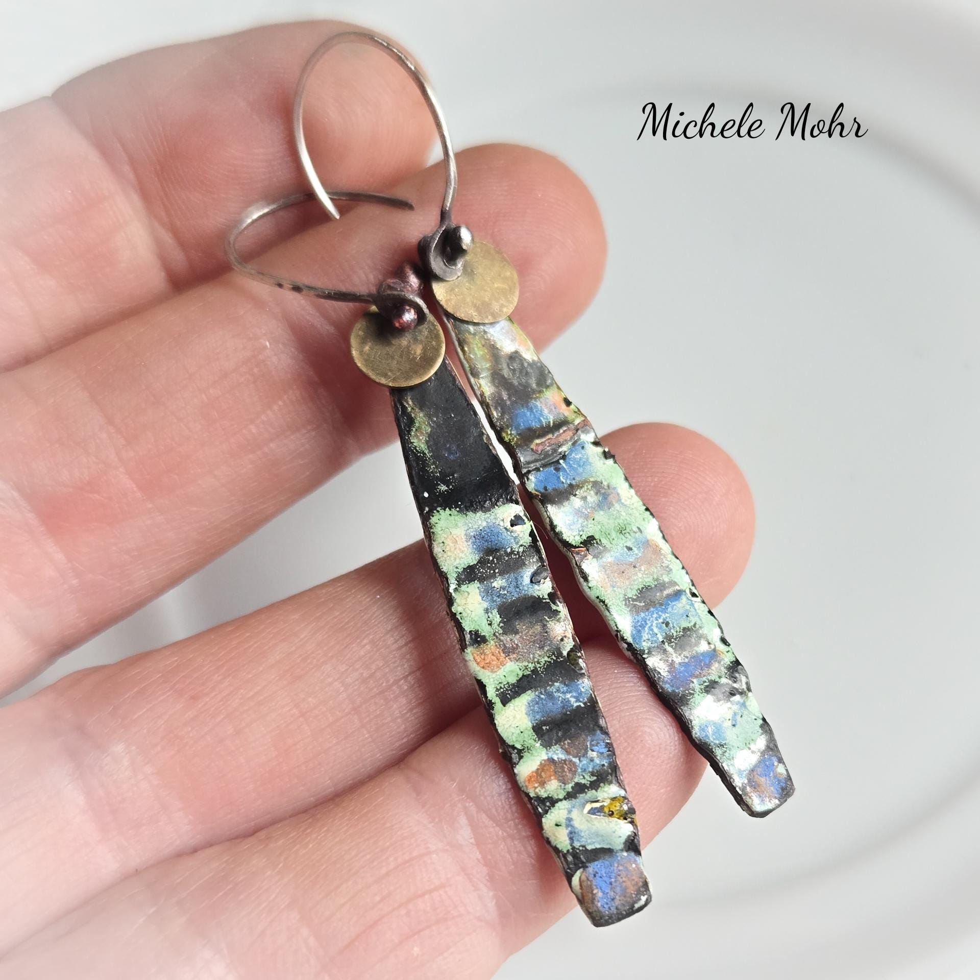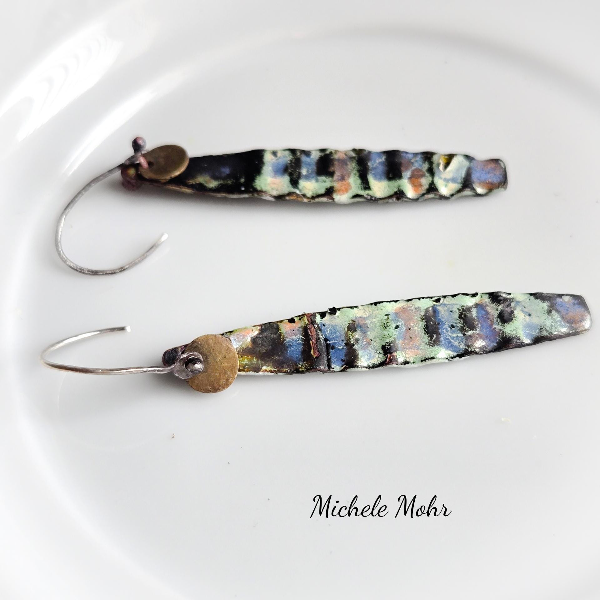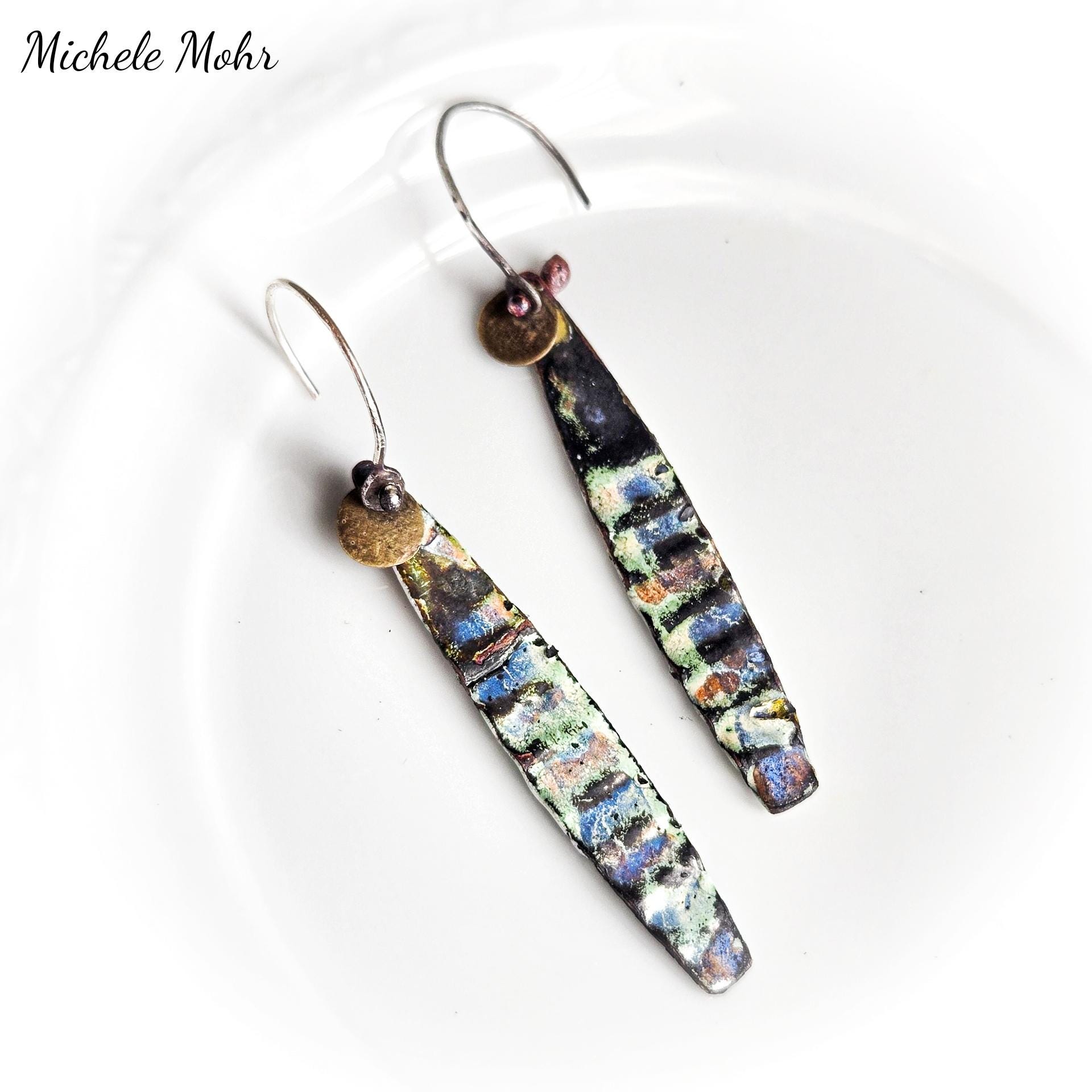 These unique one of a kind earrings have an urban edgy vibe. They are created from vitreous enamel (pigmented powdered glass), copper, and sterling silver. Brass circle accents. Multicolored.
