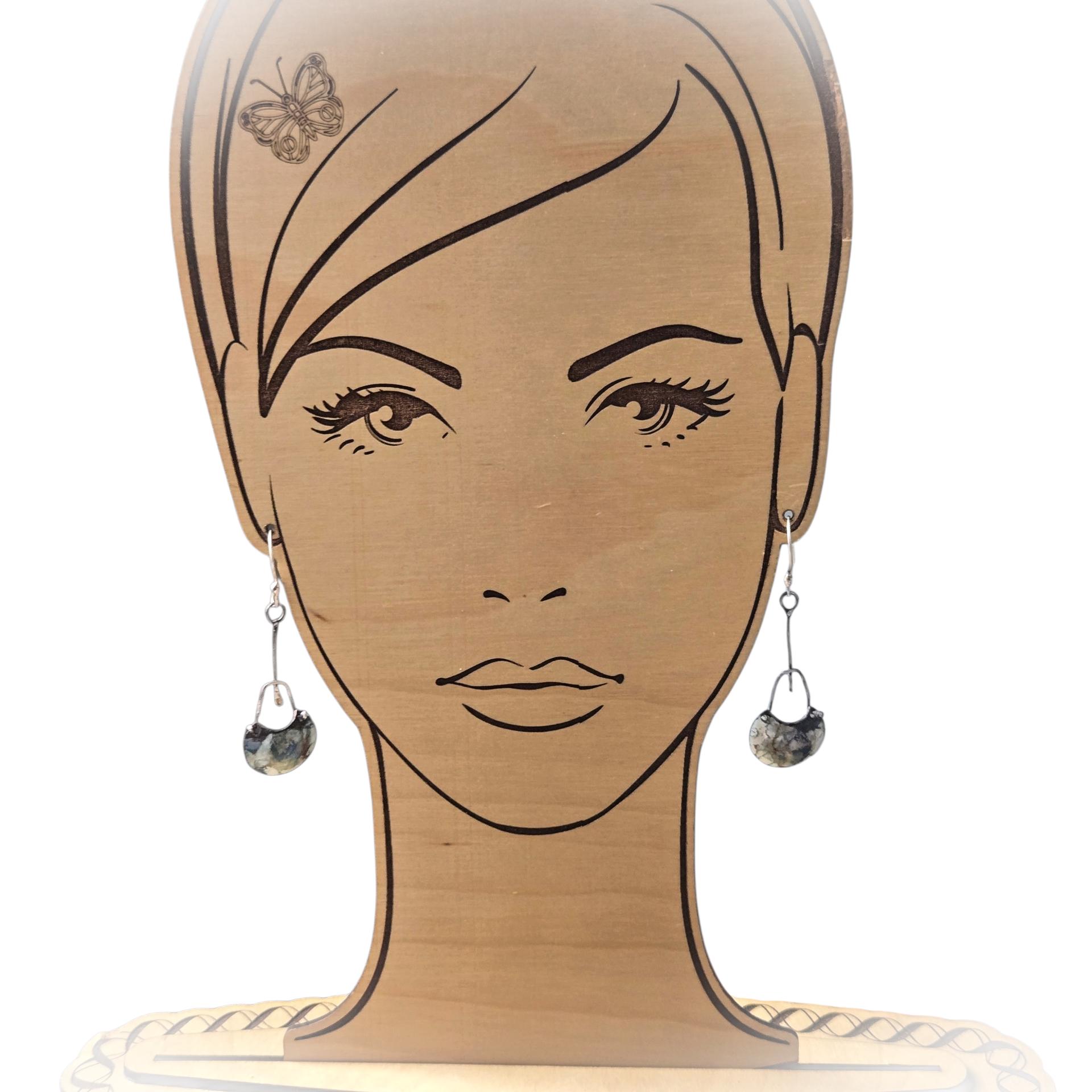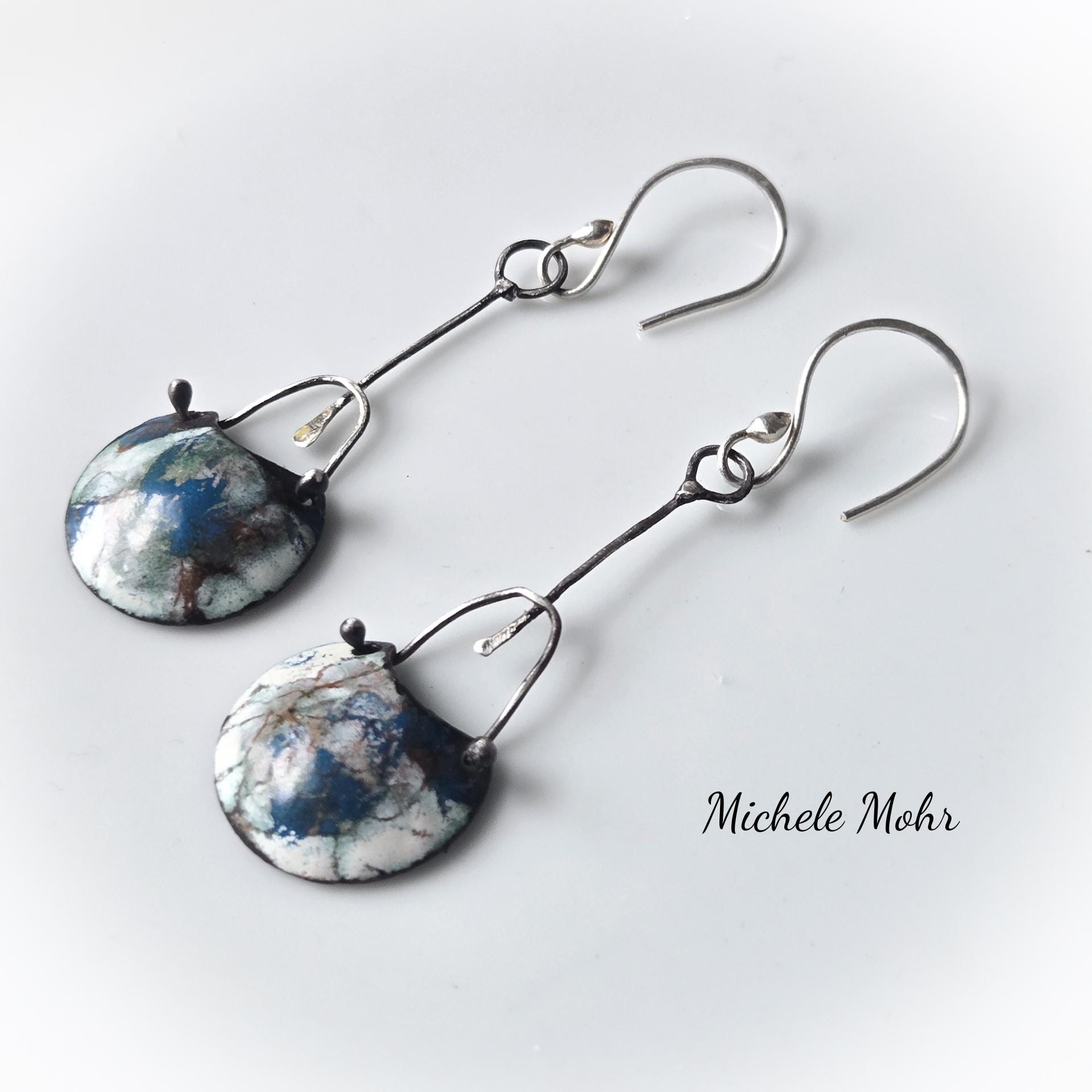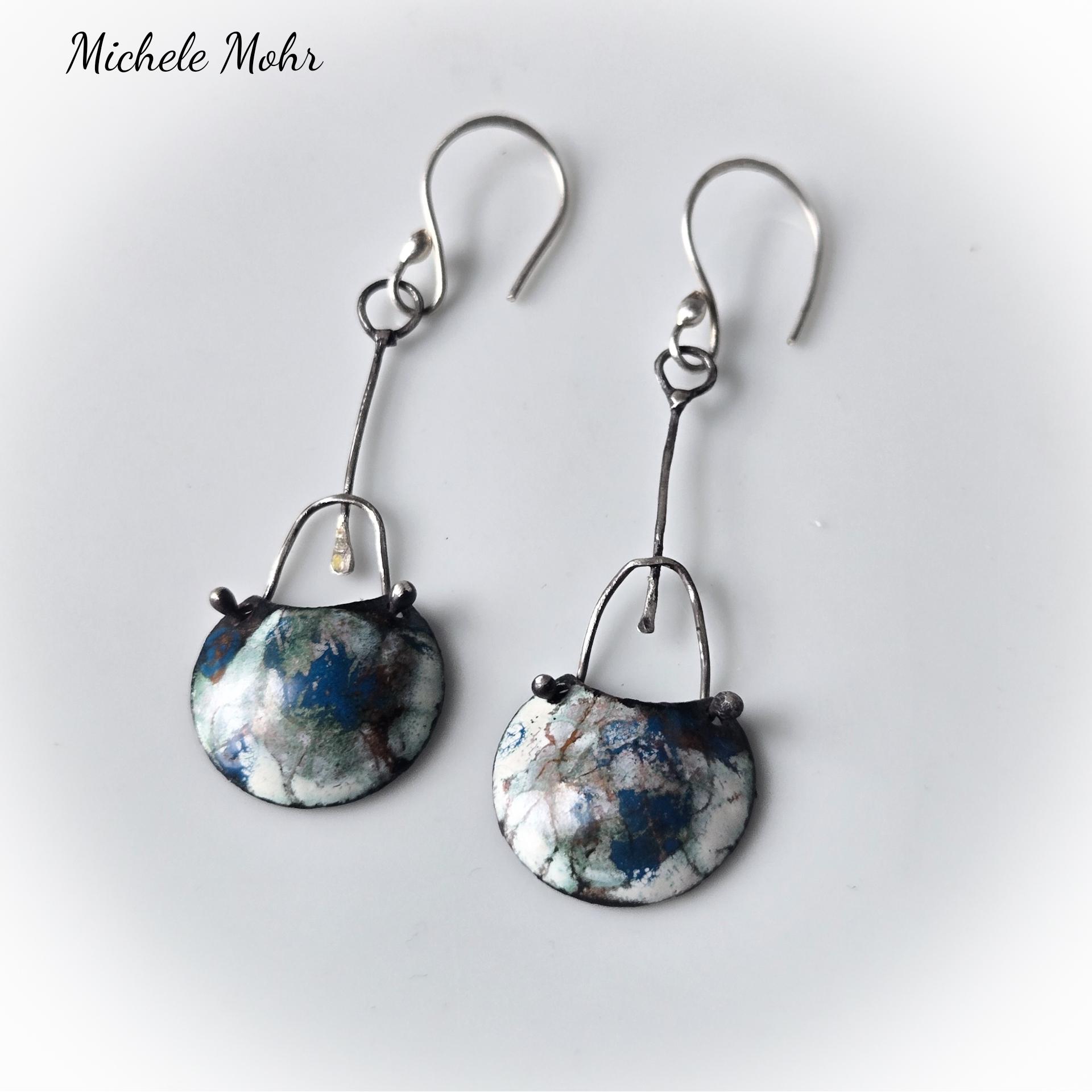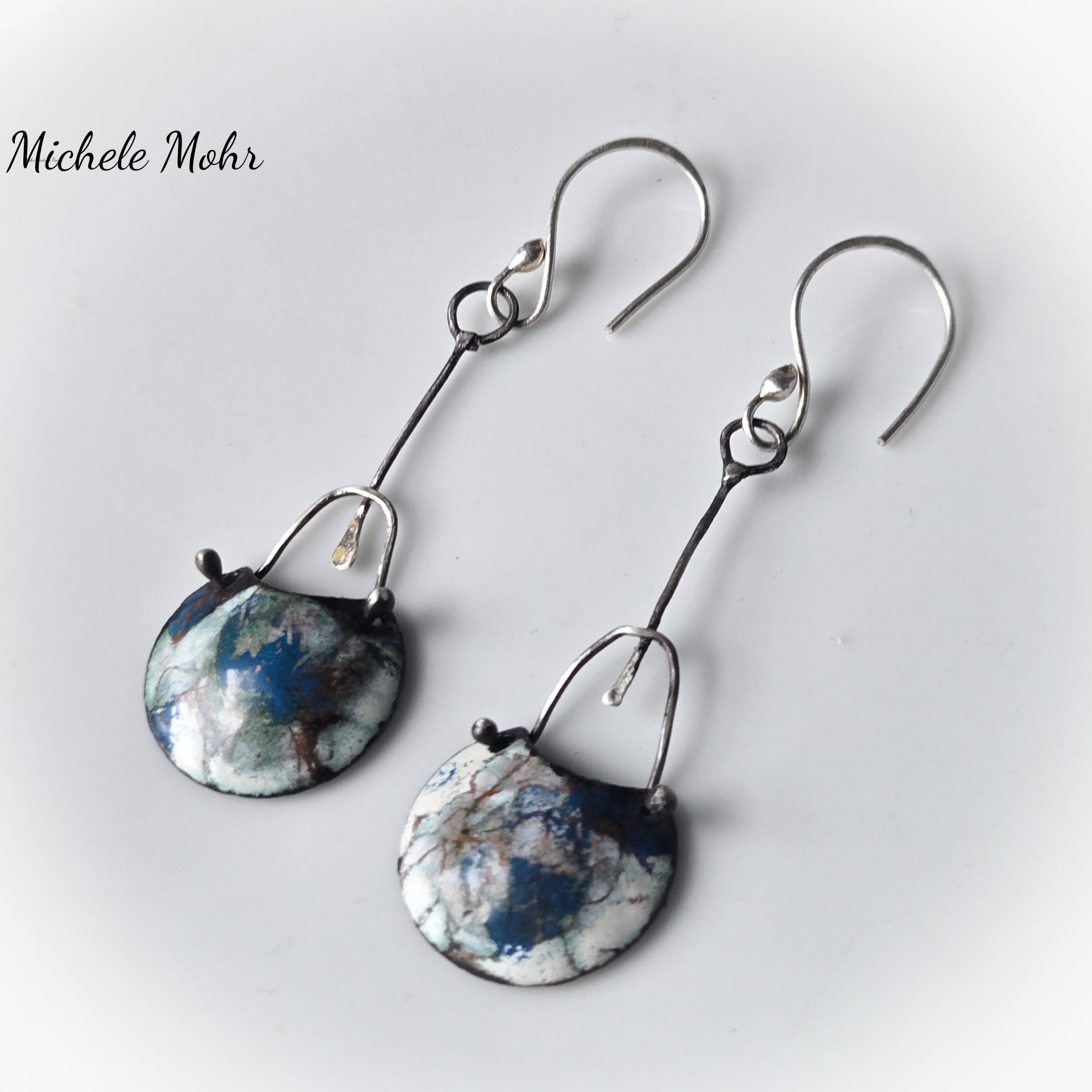 Gorgeous artsy earrings created from copper and vitreous enamel, sterling silver, and Hand forged fine silver ear hooks.