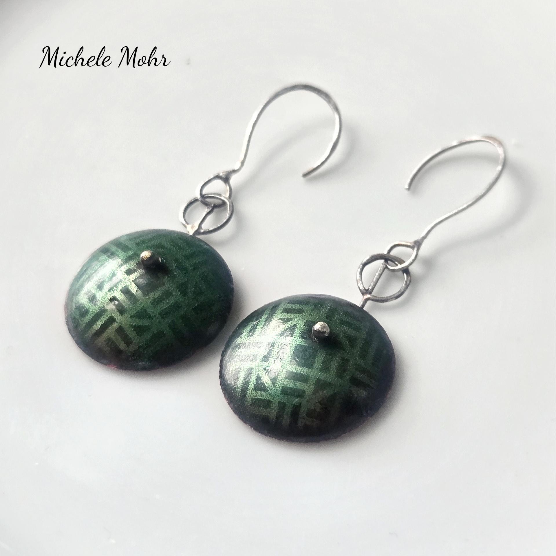 These unique one of a kind earrings have an abstract modern vibe. They are created from copper , vitreous enamel (pigmented powdered glass) and sterling silver.