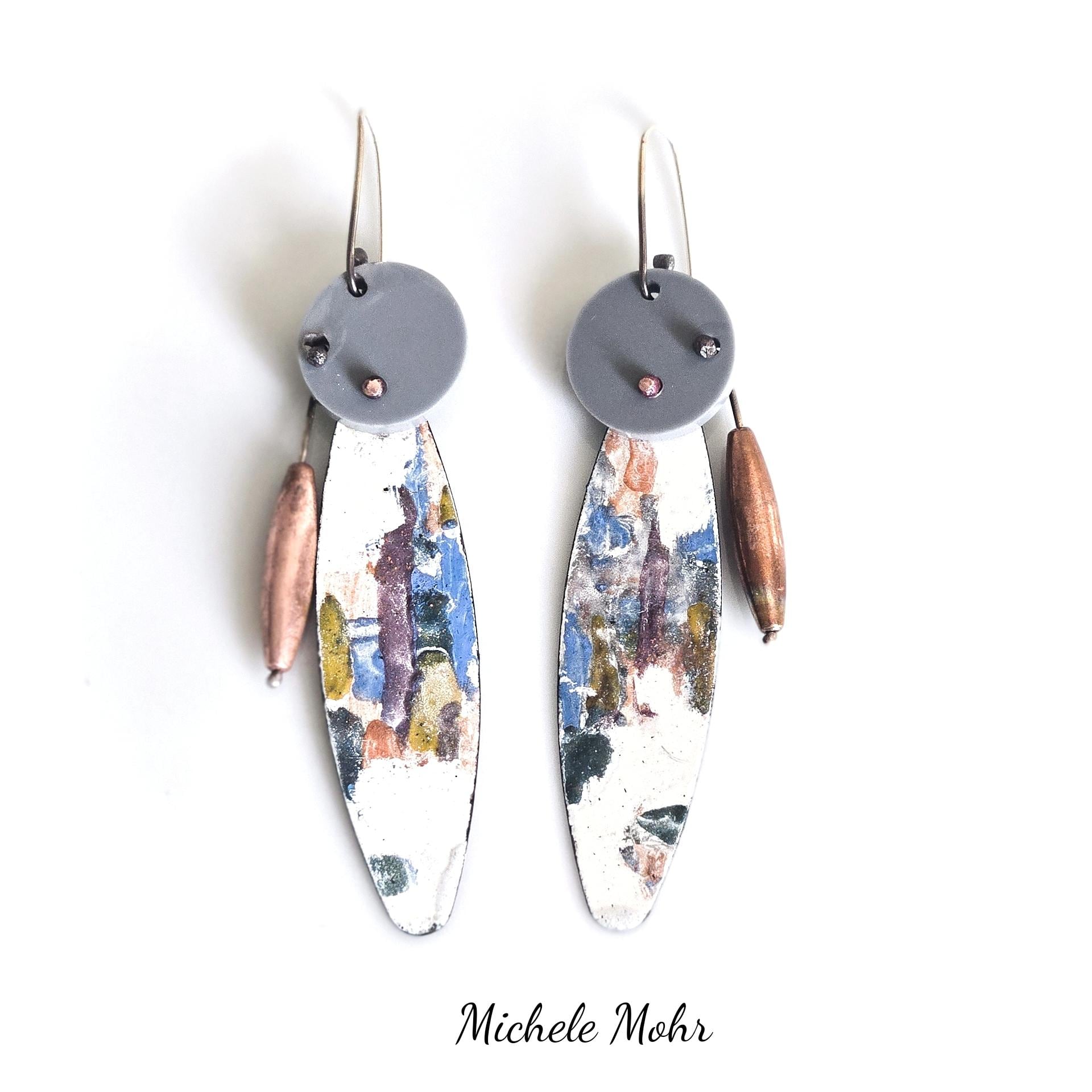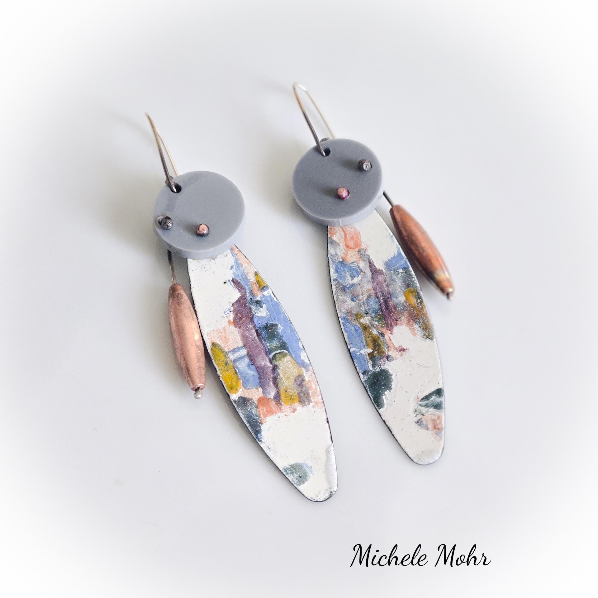 Abstract Eclectic Enameled Steel, Plexiglass Earrings with Copper Bead and Sterling Silver Ear Wires
